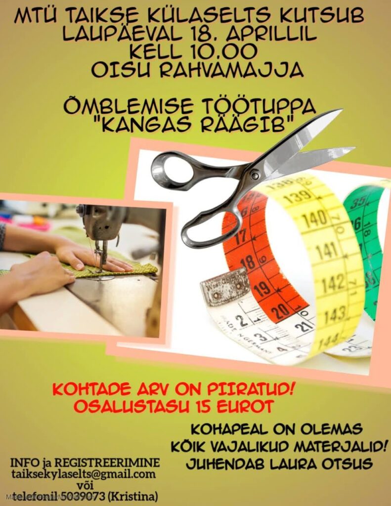 MTÜ Taikse Külaselts kutsub õmblemise töötuppa ”Kangas räägib” Oisu rahvamajas 18. aprill kell 10.00