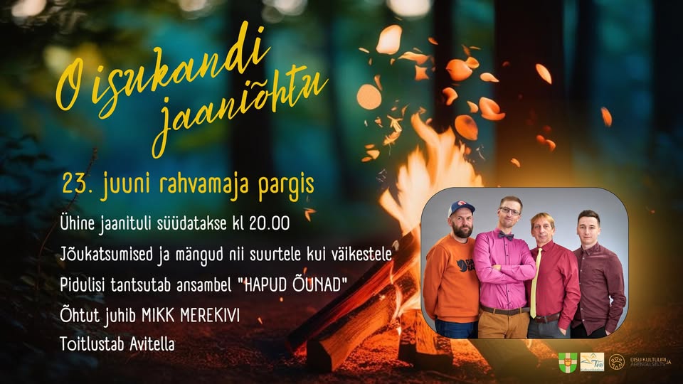 Oisukandi ühine jaanituli rahvamaja pargis.Pakume meelelahutust elava muusika, ja mängudega.Olete kõik rõõmsasti peole palutud!Üritus on tasuta! Facebook