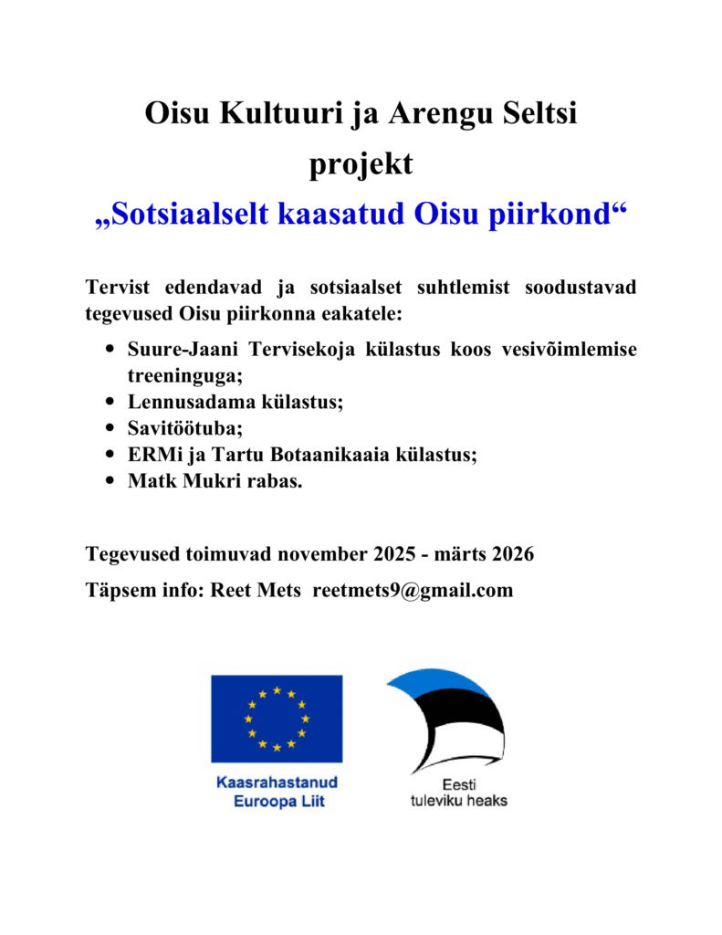 Oisu Kultuuri ja Arengu Selts korraldab tervist edendavaid ja sotsiaalset suhtlemist soodustavaid tegevusi Oisu piirkonna eakatele. Novembrist 2025 kuni märtsini 2026 toimuvad erinevad tegevused:
