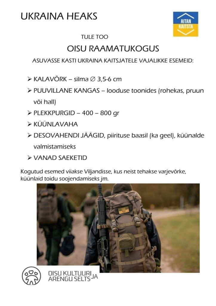 Oisu raamatukogus on kastid, kuhu saab tuua Ukraina toetuseks vajalikku. Kampaaniat korraldab koos Viljandi vabatahtlikega Oisu Kultuuri ja Arengu Selts.