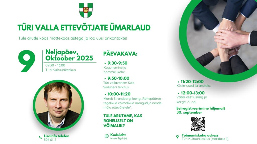 9. oktoobril 2025 kell 9.30–13.00 toimub Türi kultuurimajas ettevõtjate ümarlaud – kohtumispaik, kus saavad kokku mõtted, kogemused ja tulevikku vaatavad ideed.